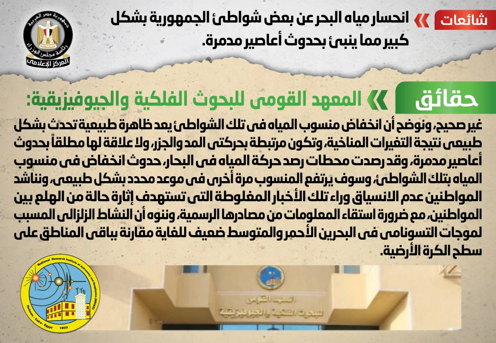 وأكد المعهد القومى للبحوث الفلكية، أنه لا صحة لانحسار مياه البحر عن بعض شواطئ الجمهورية نتيجة موجات مد بحري (تسونامي) نتيجة وجود زلازل كبير في البحر المتوسط، موضحًا أن انخفاض منسوب المياه في تلك الشواطئ يعد ظاهرة طبيعية تحدث بشكل طبيعي نتيجة التغيرات المناخية، وتكون مرتبطة بحركتي المد والجزر، ولا علاقة لها مطلقًا بحدوث أعاصير مدمرة، وقد رصدت محطات رصد حركة المياه في البحار، حدوث انخفاض في منسوب المياه بتلك الشواطئ، وسوف يرتفع المنسوب مرة أخرى في موعد محدد بشكل طبيعي، مناشدًا المواطنين عدم الانسياق وراء تلك الأخبار المغلوطة التي تستهدف إثارة حالة من الهلع بين المواطنين، مع ضرورة استقاء المعلومات من مصادرها الرسمية، منوهًا أن النشاط الزلزالي المسبب لموجات التسونامي في البحرين الأحمر والمتوسط ضعيف للغاية مقارنة بباقي المناطق على سطح الكرة الأرضية.