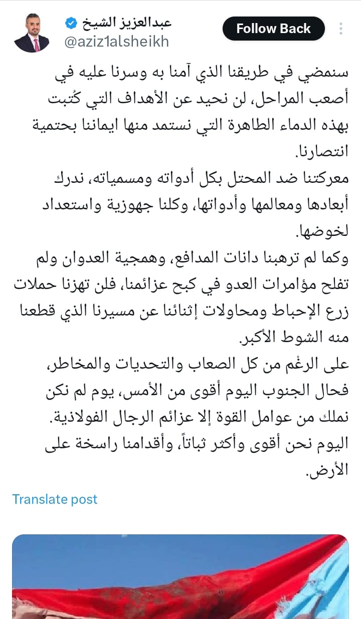 واختتم القيادي بالمجلس الانتقالي الجنوبي باليمن تغريدته قائلًا: اليوم نحن أقوى وأكثر ثباتًا، وأقدامنا راسخة على الأرض.