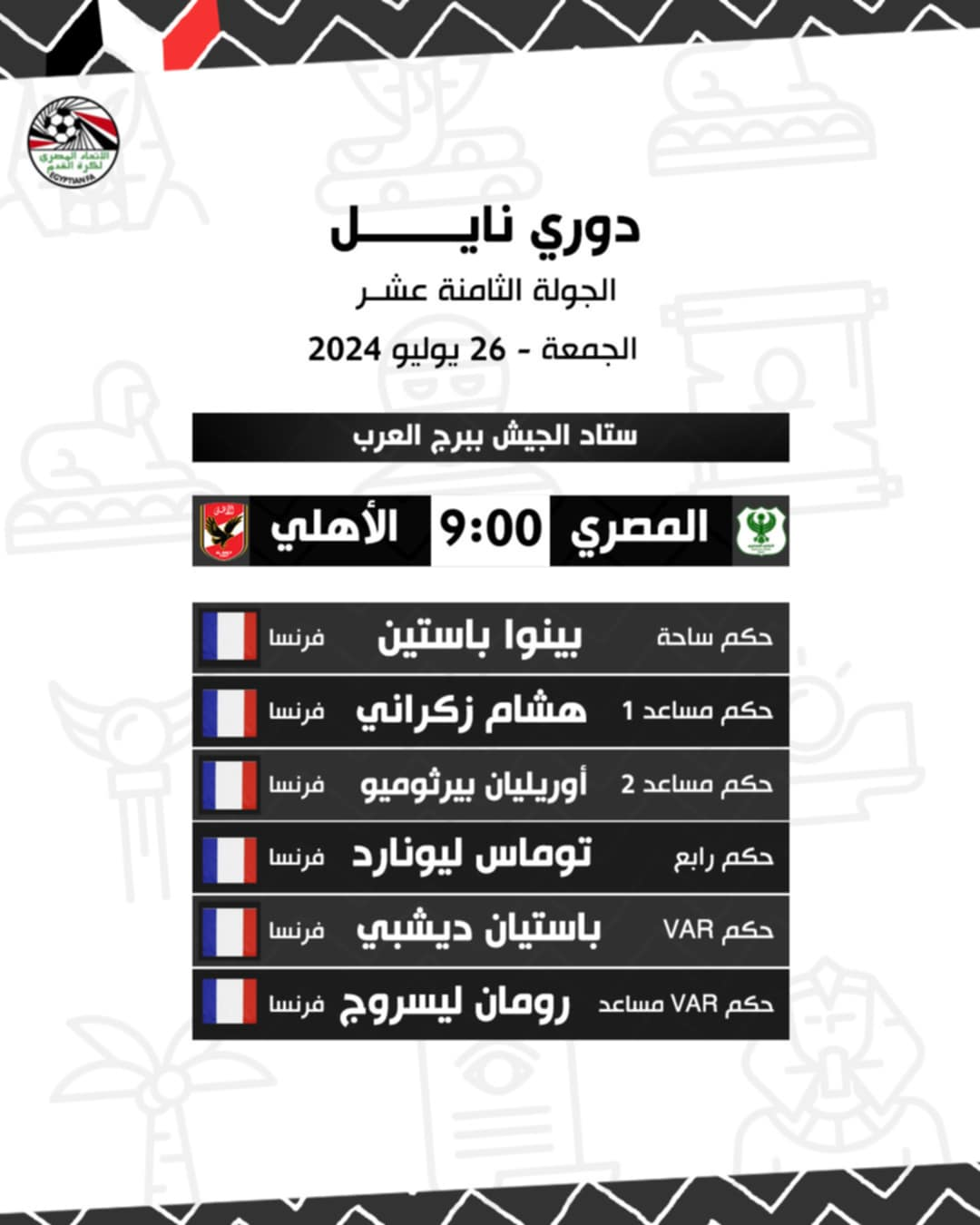 طاقم تحكيم فرنسي لإدارة مباراة الأهلي والمصري البورسعيدي بالدوري