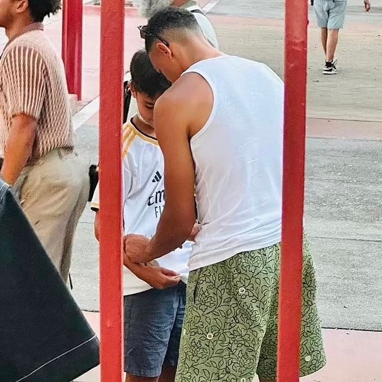 وقبلها التقطت عدسات المصورين أرنولد مع جود بيلينجهام ومقربين منهما، وهما يقضيان الإجازة في لوس أنجلوس.
