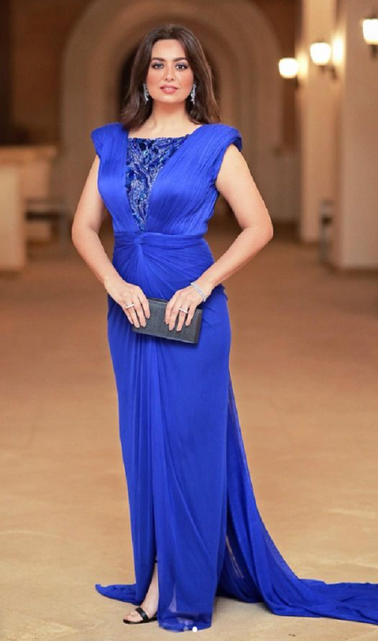 اختارت في إحدى إطلالتها فستان دون كمين من اللون الأزرق مناسب المقاس مع طول أكثر من الخلف، مع تصفيف الشعر منسدلا أيضًا.