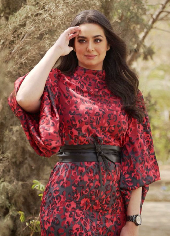 يشتهر الفستان التايجر باللون البني كما هو معروف، ولكن في هذه الإطلالة اختارت الفستان التايجر بلون آخر وهو اللون الأحمر بتصميم مختلف في الكمين أيضا.