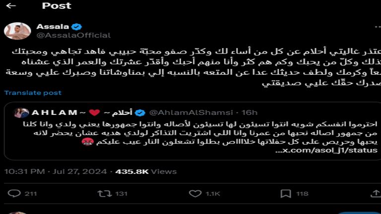 اعتذرت الفنانة أصالة للمطربة أحلام الشامسي، بعد تعبير الأخيرة عن استيائها من تعليق كتبه أحد رواد موقع X، عقب حضور نجلها حفل أقامته الأولى في إسبانيا حرص خلاله على التقاط صورة تذكارية معها.