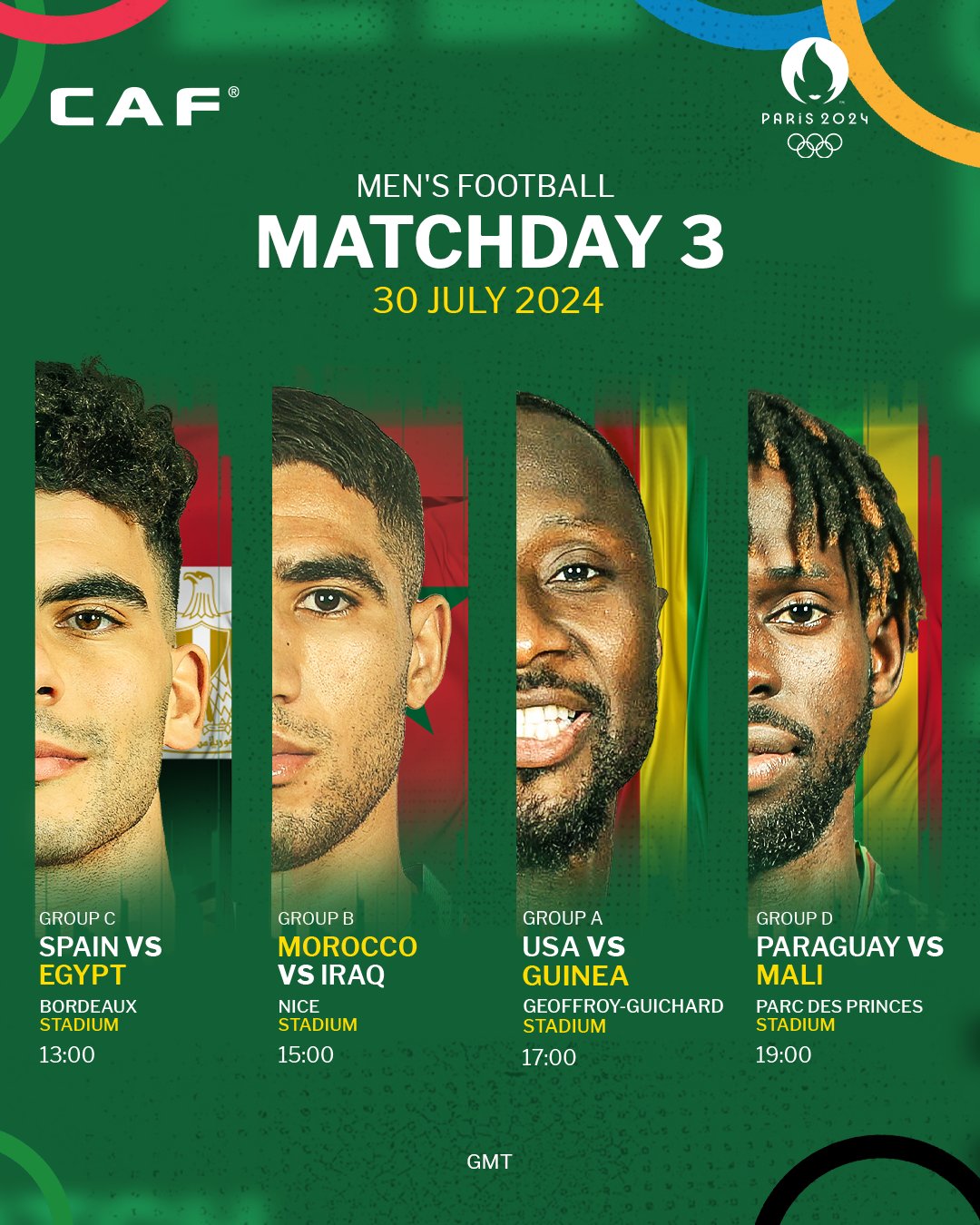 وتمتلك منتخبات إفريقيا الأربعة مصر والمغرب وغينيا ومالي فرصا للتأهل إلى ربع نهائي الأولمبياد.
