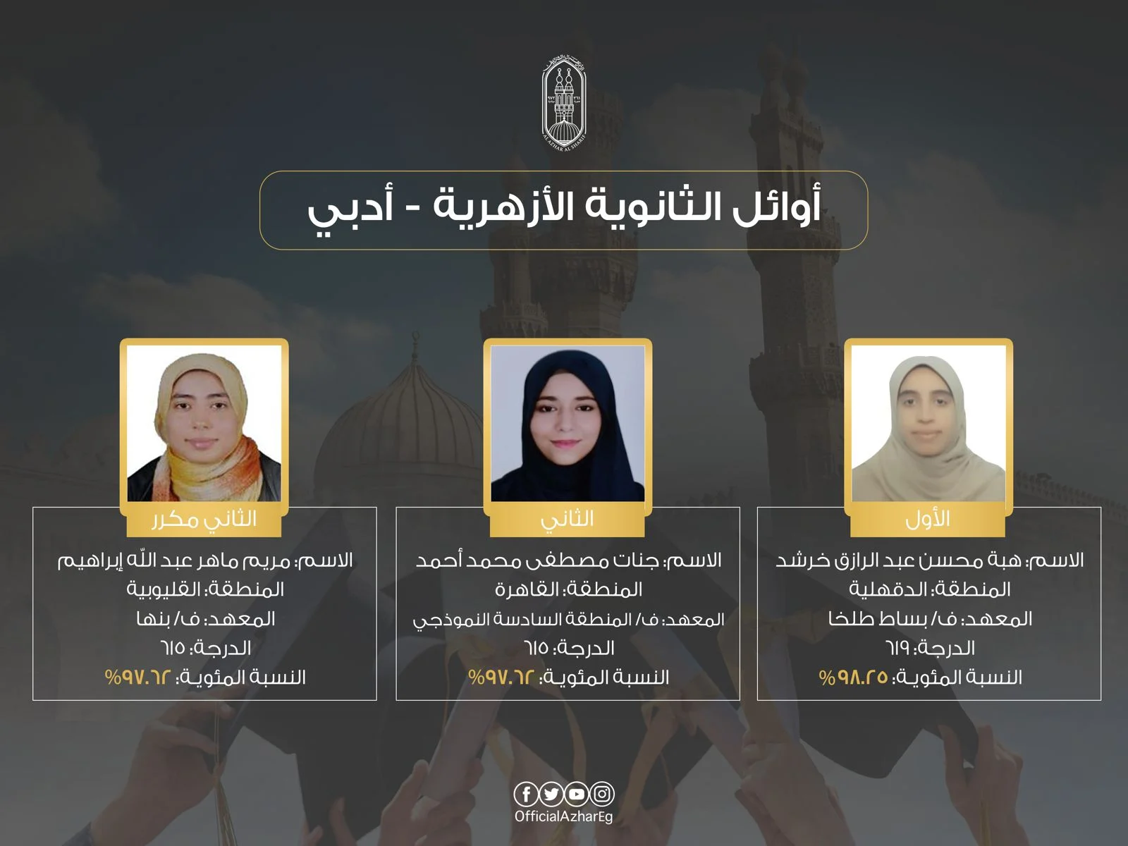 وجاءت المراكز الأولى فى الشهادة الثانوية الأزهرية لهذا العام فى القسم الأدبي: المركز الأول: هبة محسن عبد الرازق خرشد، من معهد بساط طلخا بالدقهلية، بمجموع 619 بنسبة (98.25%)، المركز الثاني: جنات مصطفى محمد أحمد حمدان، من معهد فتيات المنطقة السادسة النموذجى بالقاهرة، بمجموع 615 بنسبة (97.62%)، المركز الثانى مكرر: مريم ماهر عبد الله إبراهيم النجار، من معهد فتيات بنها بالقليوبية، بمجموع 615 بنسبة (97.62%).