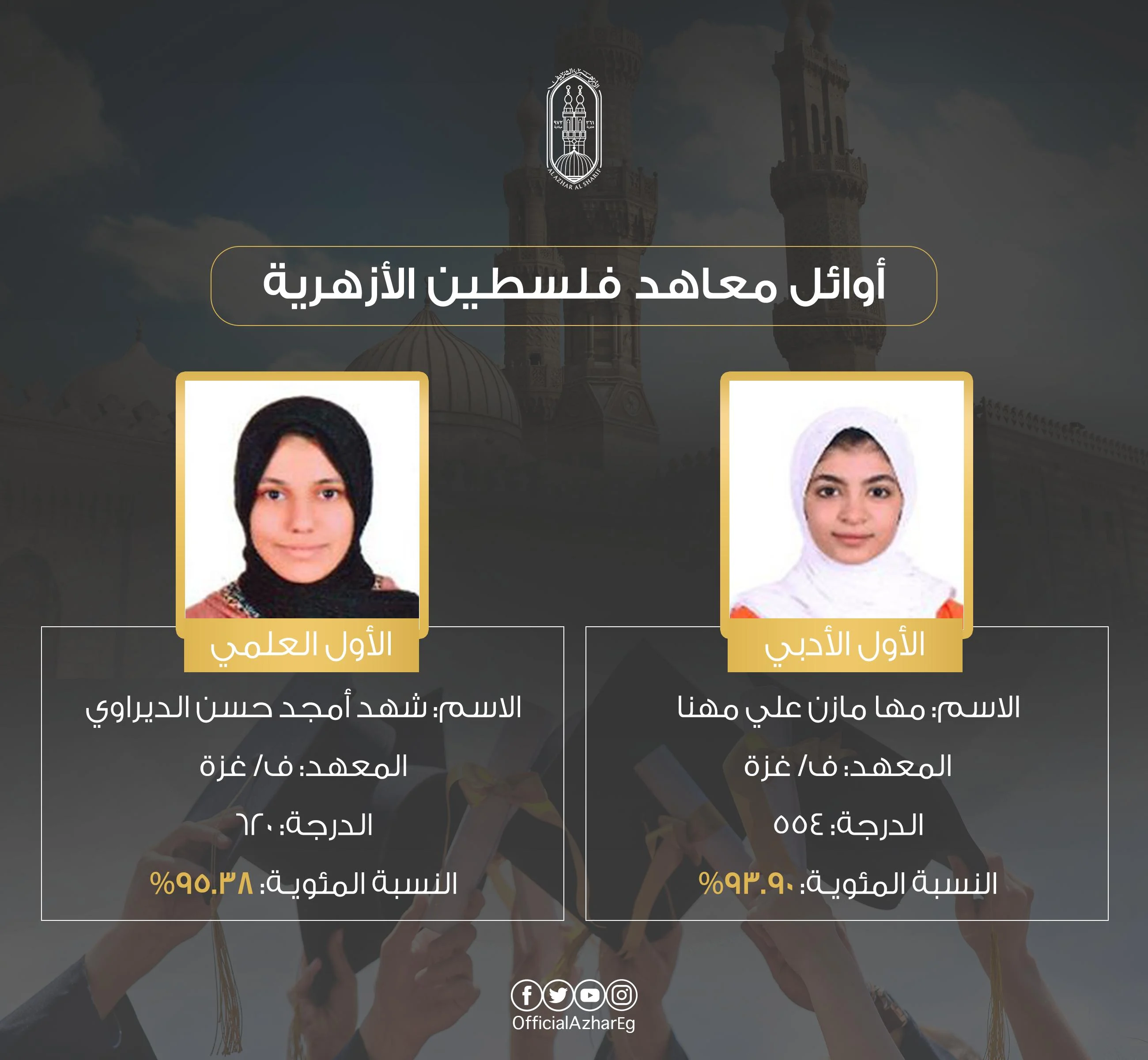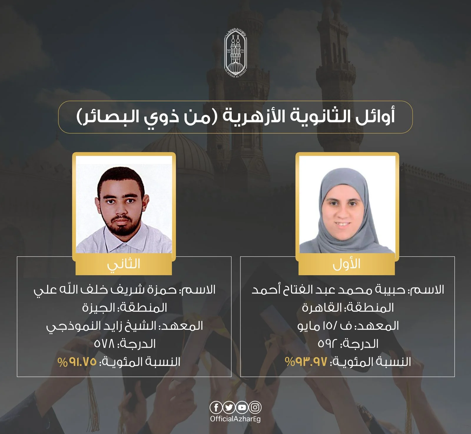 وفى أوائل الجمهورية (كفيف) جاء فى المركز الأول الطالبة حبيبة محمد عبد الفتاح أحمد، من معهد فتيات 15 مايو بالقاهرة، بمجموع 592 بنسبة (93.97%)، وجاء فى المركز الثانى الطالب حمزة شريف خلف الله على، من معهد الشيخ زايد النموذجى بالجيزة، بمجموع 578 بنسبة (91.75%). أما أوائل معاهد فلسطين الأزهرية فجاءت الطالبة شهد أمجد حسن الديراوى، من معهد فتيات غزة فى المركز الأول على القسم العلمى بمجموع 620 ونسبة (95.38%)، وجاءت الطالبة مها مازن على مهنا، من معهد فتيات غزة فى المركز الأول على القسم الأدبى بمجموع 554 ونسبة (93.90%).