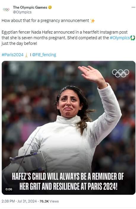 ونشر الحساب الرسمي التابع لأولمبياد باريس 2024 عبر منصة "إكس" صورة البطلة المصرية ندى حافظ معلقا عليها: "ماذا عن ذلك بالنسبة لإعلان الحمل، المبارزة المصرية ندى حافظ أعلنت أنها حامل في الشهر السابع ومع ذلك تنافست في الأولمبياد في اليوم السابق فقط".