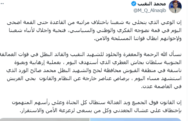 ودعا النقيب بالرحمة والمغفرة والخلود للشهيد النقيب والقائد البطل في قوات العمالقة الجنوبية، سلطان بجاش العطري، الذي استهدف اليوم بعملية إرهابية بعبوة ناسفة في منطقة الفيوش بمحافظة لحج، وكذلك للشهيد البطل محمد صالح الورد، الذي استشهد مساء اليوم برصاص عناصر خارجة عن النظام والقانون في حي العريش بالعاصمة عدن.