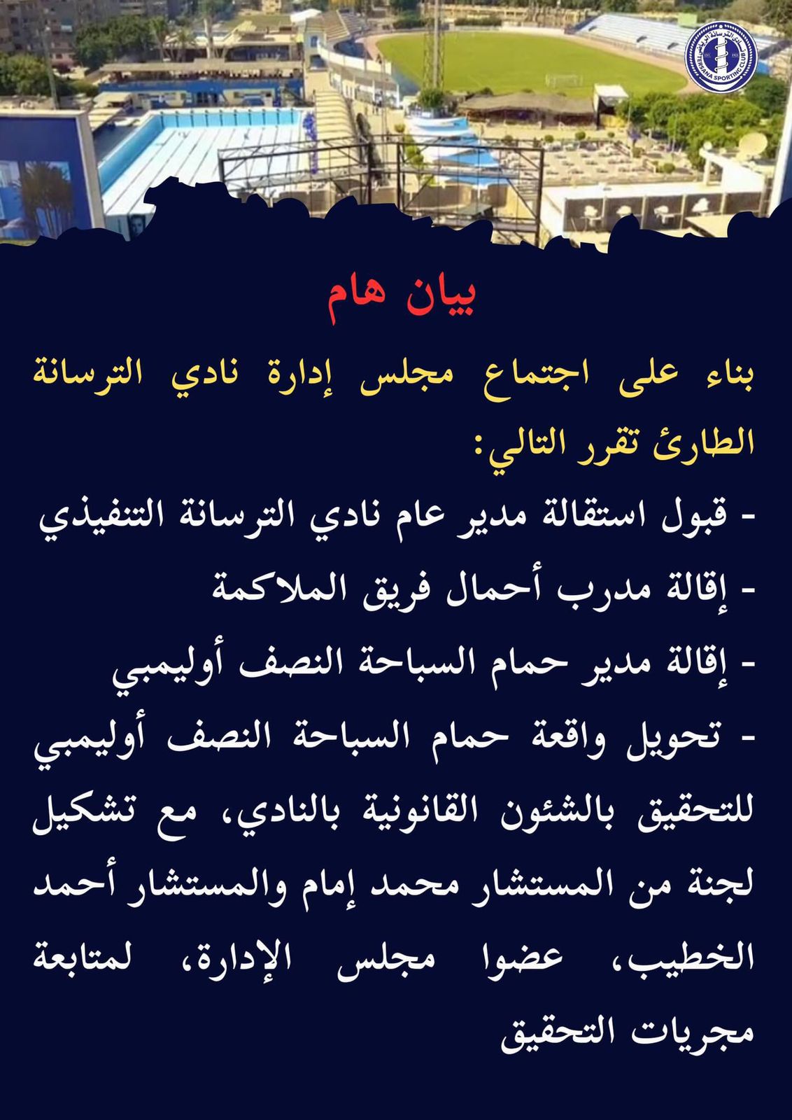 بناء على اجتماع مجلس إدارة نادي الترسانة الطارئ تقرر التالي: