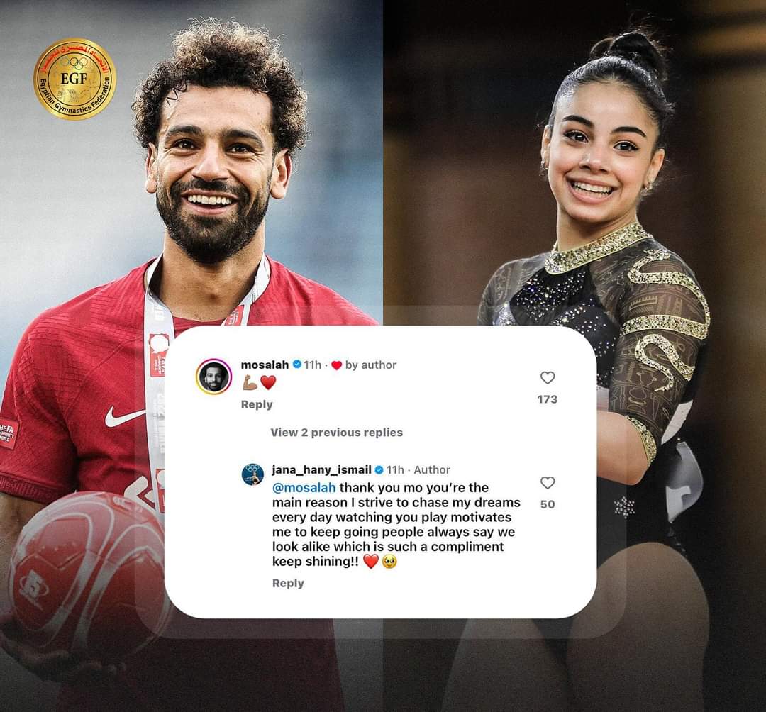 ونشرت جنى محمود عبر موقع "إنستجرام" للتواصل الاجتماعي صورة تحفيز محمد صلاح لها بإشارات تعبيرية عقب الانتهاء من مشاركتها الأولمبية.