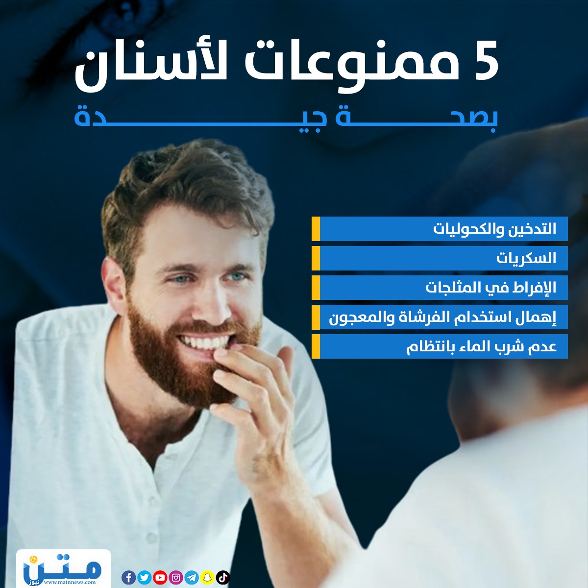 5 ممنوعات لأسنان بصحة جيدة (إنفوجراف) الثلاثاء 06/أغسطس/2024 - 07:07 م 8/6/2024 7:07:39 PM انفوجراف متن محمد حسن شارك طباعة التدخين والكحولياتالسكرياتالإفراط في المثلجاتإهمال استخدام الفرشاة والمعجونعدم شرب الماء بانتظام شارك الكحول شرب الماء السكر السكريات منوعات