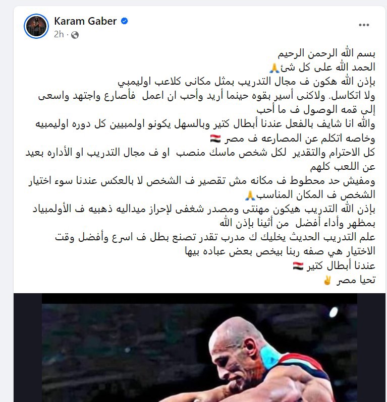 وقال كرم جابر عبر حسابه بموقع التواصل الاجتماعي "فيس بوك": "بإذن الله سأكون في مجال التدريب بمثل مكانتي كلاعب أولمبي، ولا أتكاسل ولكني أسير بقوة حينما أريد وأحب أن أعمل، فأصارع واجتهد وأسعى إلى قمة الوصول فيما أحب".