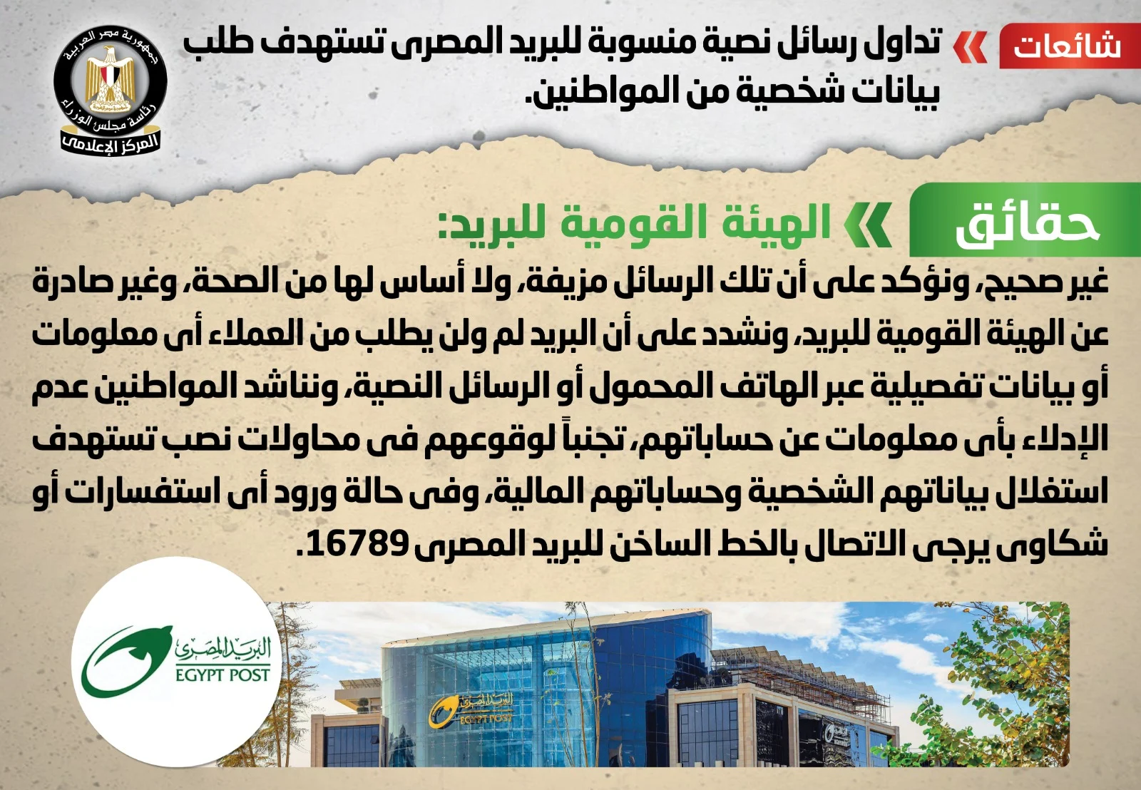 كشف المركز الإعلامى لمجلس الوزراء، إنه فى ضوء ما تم تداوله من بعض صفحات التواصل الاجتماعي رسائل نصية منسوبة للبريد المصري تستهدف طلب بيانات شخصية من المواطنين، تواصل المركز مع الهيئة القومية للبريد، والتي نفت تلك الأنباء، مُؤكدةً أنه لا صحة لإرسال البريد المصري أي رسائل تستهدف طلب أي بيانات من المواطنين تخص حساباتهم أو عناوينهم أو أي بيانات أخرى بزعم دفع تكاليف الشحن، وأن تلك الرسائل مزيفة، ولا أساس لها من الصحة، وغير صادرة عن الهيئة القومية للبريد.