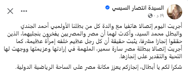 وأضافت السيدة انتصار السيسي، في تدوينة لها عبر حسابها الرسمي على موقع التواصل الاجتماعي “فيسبوك”: كما أجريت اتصالا ببطلة مصر سارة سمير، الملهمة في إرادتها وعزيمتها ووجهت لها التحية والتقدير على إنجازها.