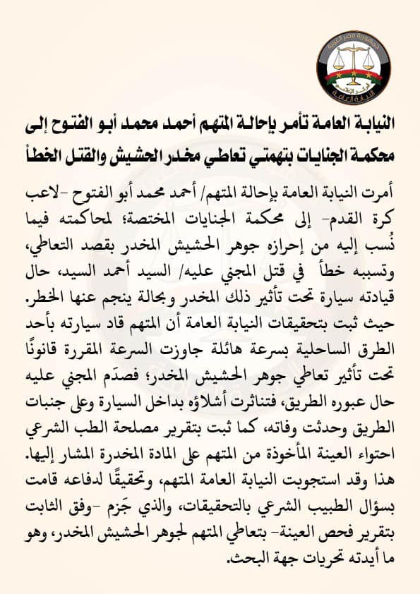 أمرت النيابة العامة بإحالة المتهم أحمد محمد أبو الفتوح - لاعب كرة القدم - إلى محكمة الجنايات المختصة، لمحاكمته فيما نُسب إليه من إحرازه جوهر الحشيش المخدر بقصد التعاطي، وتسببه خطأ في قتل المجني عليه السيد أحمد السيد، حال قيادته سيارة تحت تأثير ذلك المخدر وبحالة ينجم عنها الخطر.