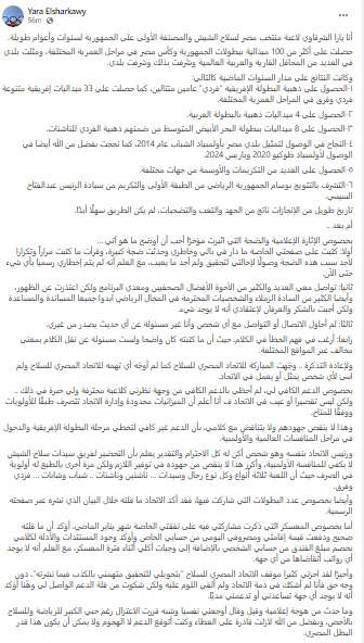 كما ألمحت اللاعبة لاعتزالها لعبة السلاح في الفترة المقبلة، حيث جاء البيان كالتالي: