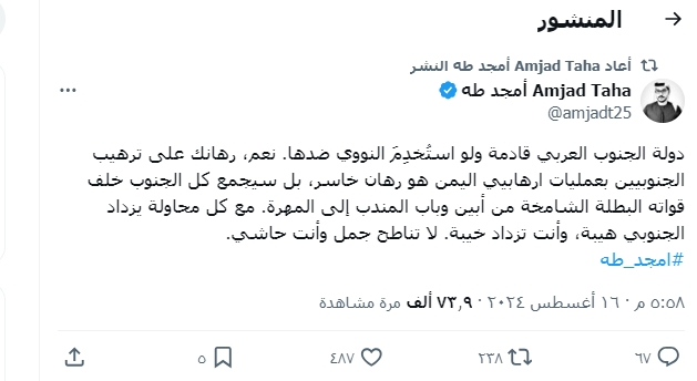 قال أمجد طه، خبير الشؤون الخارجية، إن دولة الجنوب العربي قادمة ولو استُخدِمَ النووي ضدها.