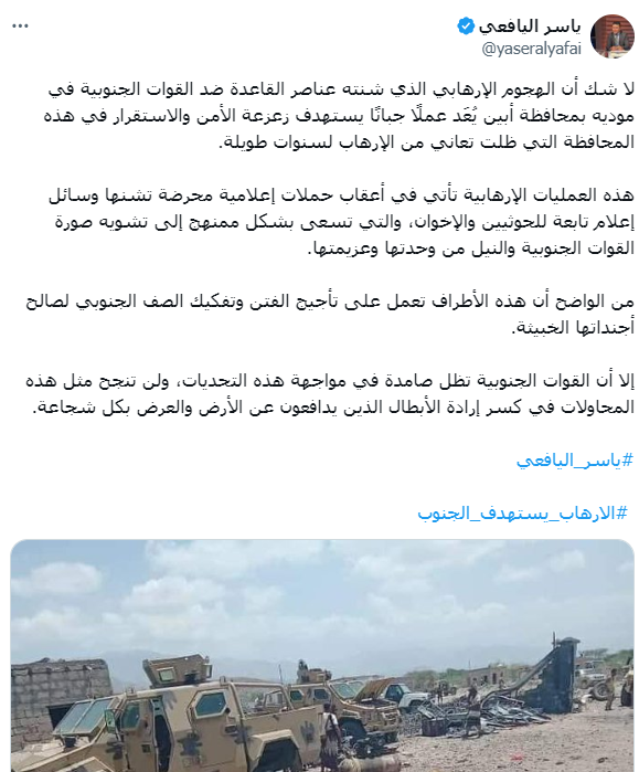 قال الإعلامي بجنوب اليمن ياسر اليافعي بأنه لا شك أن الهجوم الإرهابي الذي شنته عناصر القاعدة ضد القوات الجنوبية باليمن في موديه بمحافظة أبين يُعَد عملًا جبانًا يستهدف زعزعة الأمن والاستقرار في هذه المحافظة التي ظلت تعاني من الإرهاب لسنوات طويلة.