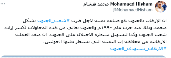 قال الناشط السياسي بجنوب اليمن محمد هشام إن الإرهاب بالجنوب هو صناعة يمنية لاجل ضرب شعب الجنوب بشكل متعمد.