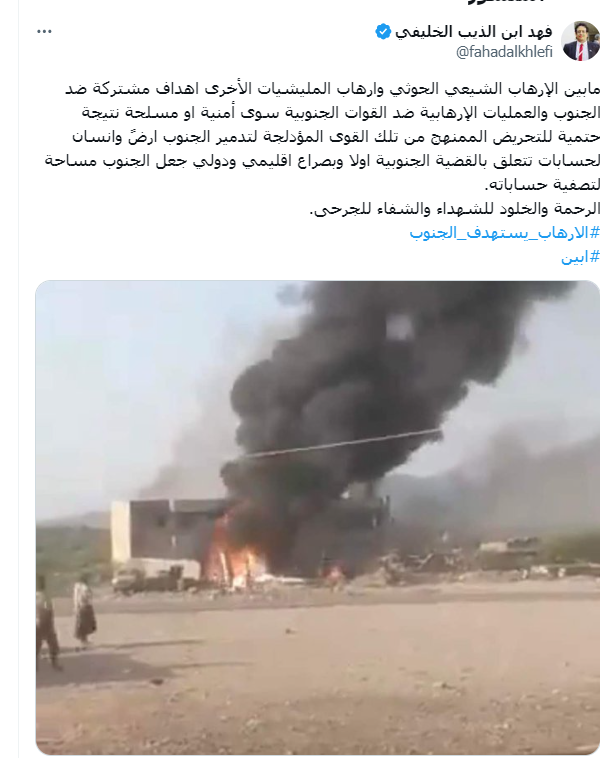 قال المحلل السياسي بجنوب اليمن فهد ابن الذيب الخليفي تعقيبا على العمليات الارهابية في أبين، بأنه مابين الإرهاب الشيعي الحوثي وارهاب المليشيات الأخرى أهداف مشتركة ضد الجنوب.
