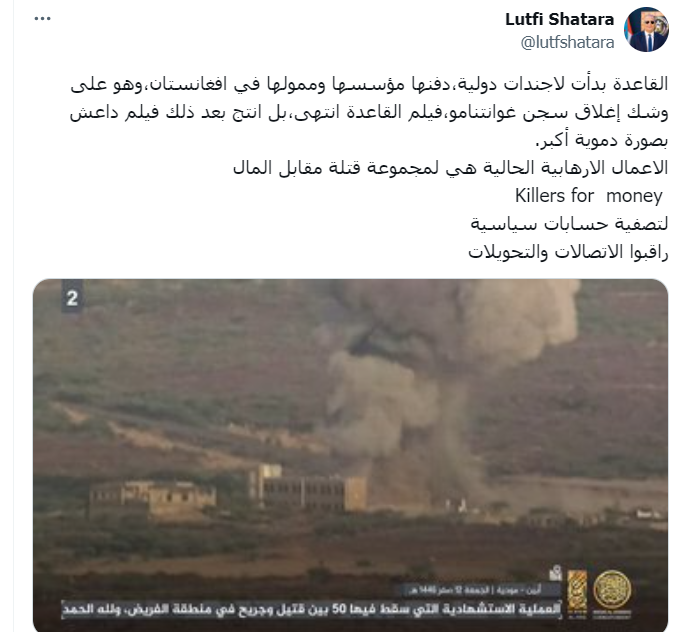 وكتب شطارة على منصة (اكس): القاعدة بدأت لاجندات دولية، دفنها مؤسسها وممولها في افغانستان، وهو على وشك إغلاق سجن غوانتنامو، فيلم القاعدة انتهى، بل انتج بعد ذلك فيلم داعش بصورة دموية أكبر، الاعمال الارهابية الحالية هي لمجموعة قتلة مقابل المال Killers for money لتصفية حسابات سياسية راقبوا الاتصالات والتحويلات.