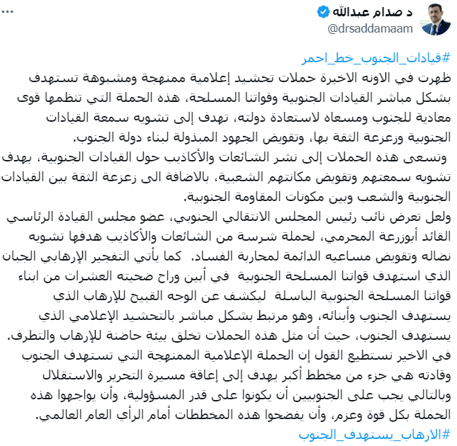 قال الدكتور صدام عبدالله رئيس قطاع الصحافة والاعلام بالمجلس الانتقالي الجنوبي مستشار اللواء عيدروس الزُبيدي إنه ظهرت في الاونه الاخيرة حملات تحشيد إعلامية ممنهجة ومشبوهة تستهدف بشكل مباشر القيادات الجنوبية وقواتنا المسلحة، هذه الحملة التي تنظمها قوى معادية للجنوب ومسعاه لاستعادة دولته، تهدف إلى تشويه سمعة القيادات الجنوبية وزعزعة الثقة بها، وتقويض الجهود المبذولة لبناء دولة الجنوب.