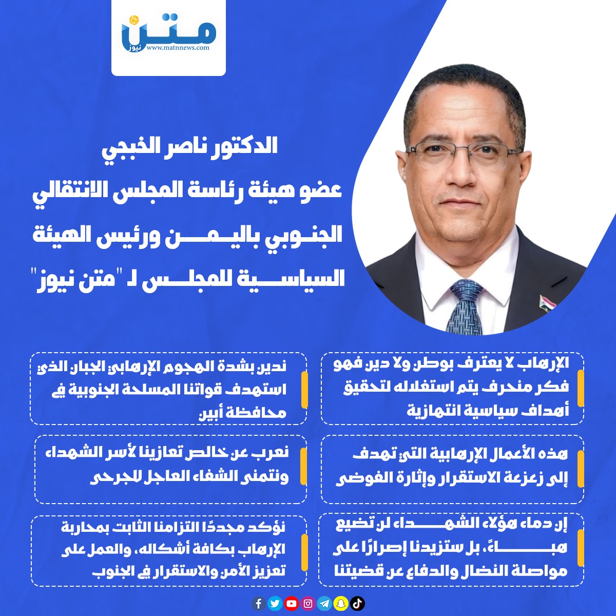الدكتور ناصر الخبجي عضو هيئة رئاسة المجلس الانتقالي الجنوبي باليمن ورئيس الهيئة السياسية للمجلس لـ "متن نيوز"