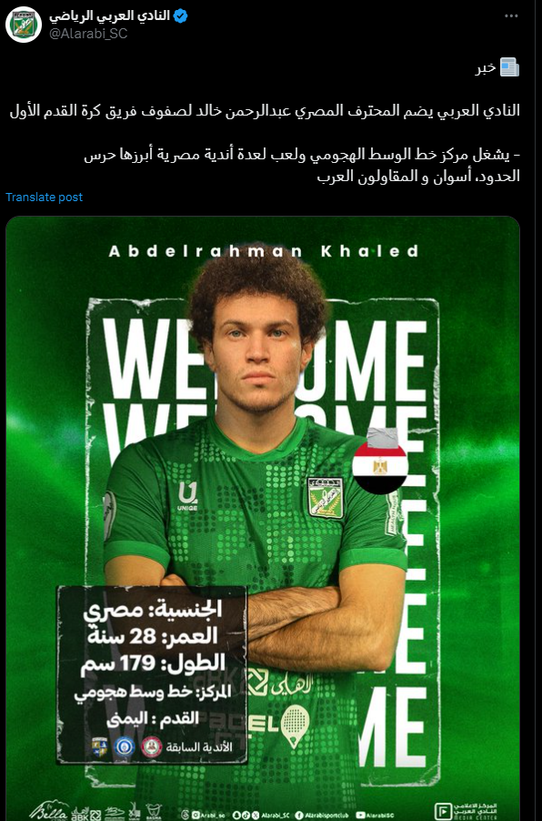 أعلن اللاعب المصري عبد الرحمن خالد "جبنة" رحيله عن النادي العربي الكويتي، بعد 11 يومًا فقط من انتقاله إلى الأخضر خلال الانتقالات الصيفية الحالية.