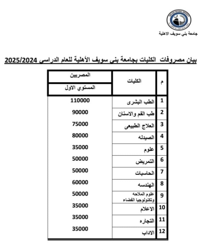 مصاريف جامعة بني سويف الأهلية 2024-2025