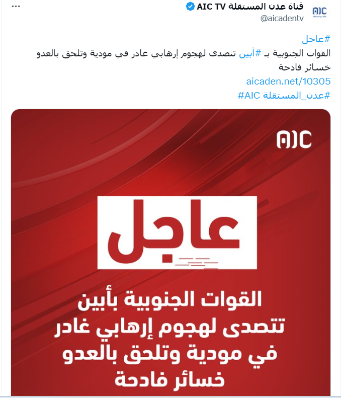 وكشفت مصادر أن وحدات من قوات الحزام تمكنت من التصدي الفوري والباسل لهذا الهجوم الذي شنته العناصر الإرهابية على موقع تابع لقواتنا بوادي الجزع بين منطقتي امبقيرة وامصرة بمديرية مودية.. لافتا إلى تكبيد التنظيم الإرهابي خسائر فادحة.