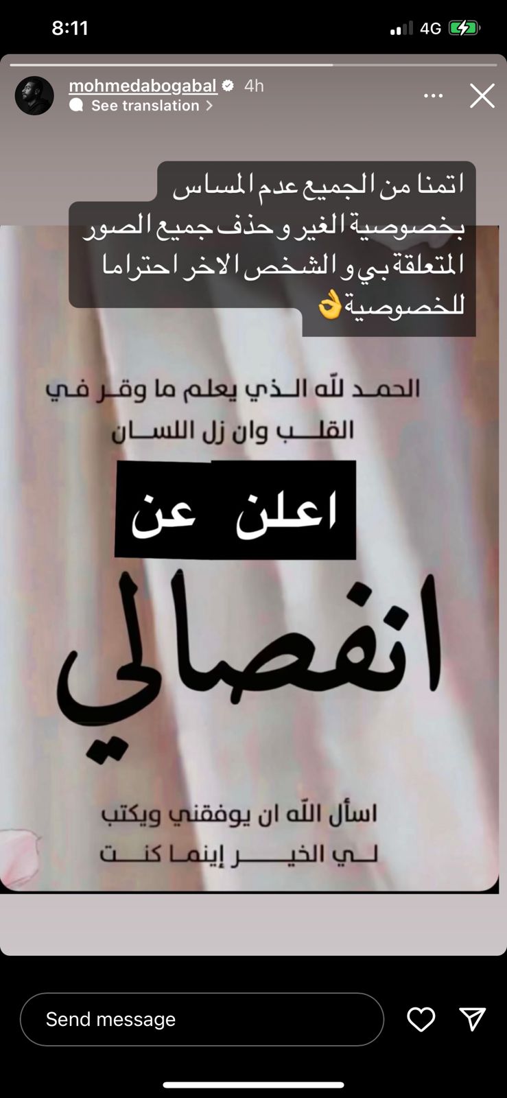 وشارك محمد أبو جبل متابعيه عبر منصة تداول الصور والفيديوهات "إنستجرام"، بـ خاصية الاستوري خبر انفصاله عن زوجته الجزائرية الأميرة سمارة يحيى بعد زواج دام أكثر من عامين.