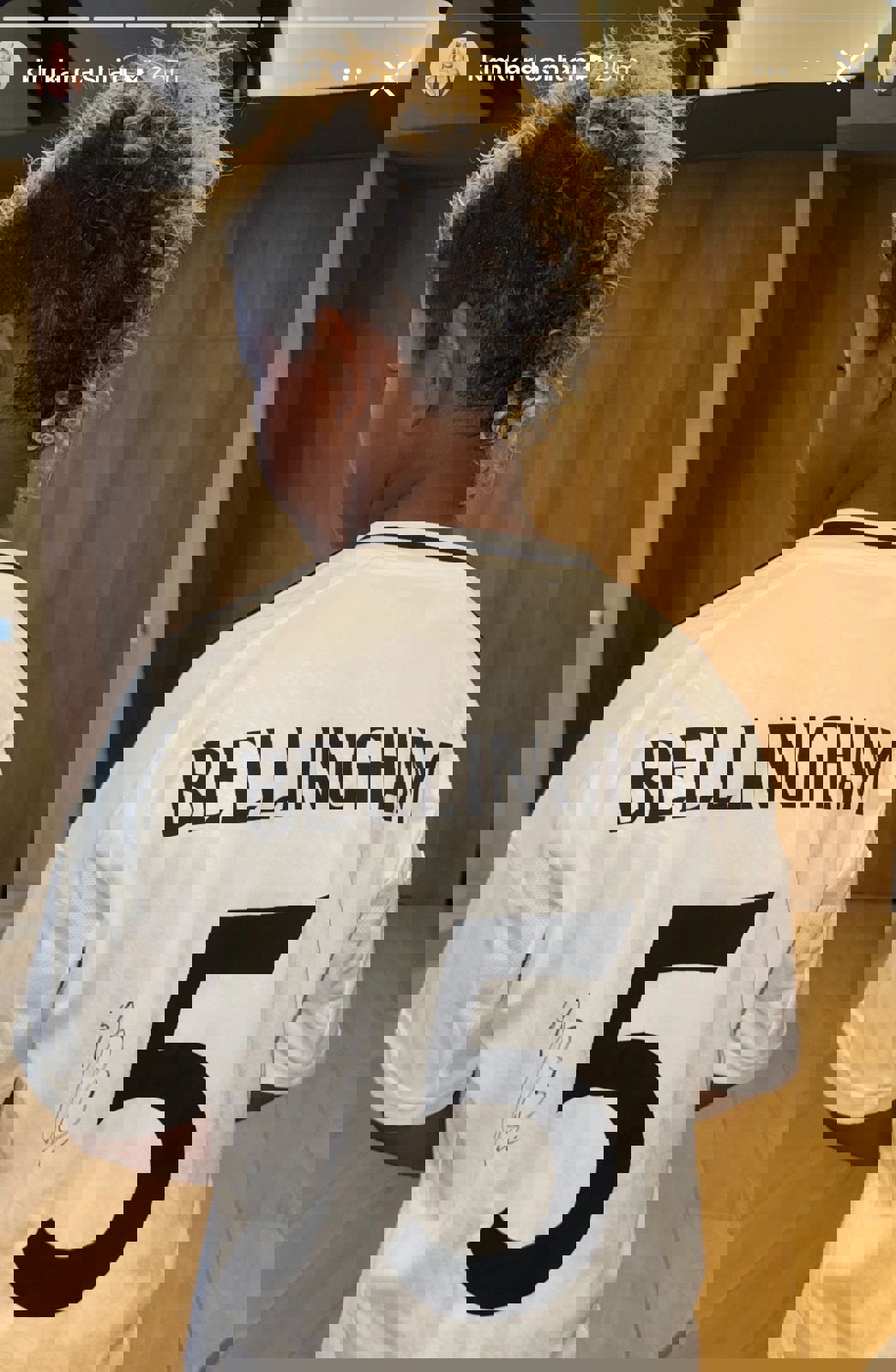 وظهر ابنها سانت ويست وهو يرتدي قميصًا لريال مدريد باسم بيلينجهام وموقعًا منه.