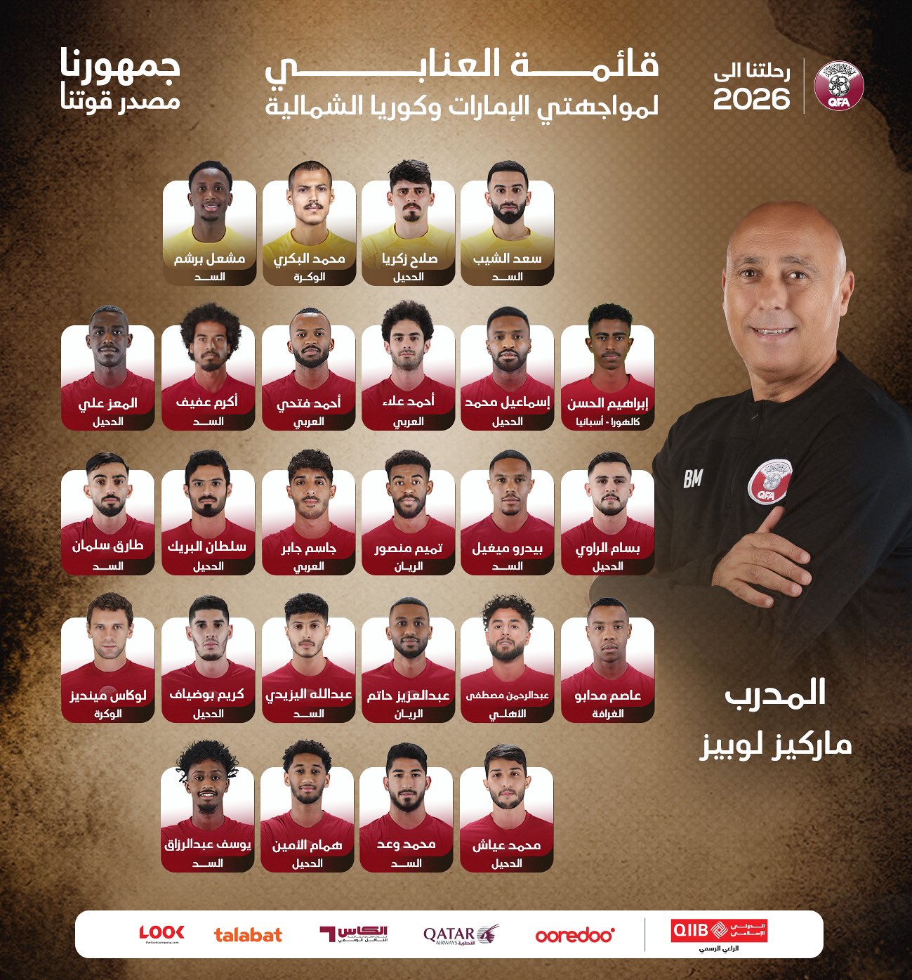 أعلن الإسباني ماركيز لوبيز المدير الفني لمنتخب قطر، قائمة العنابي لمواجهتي الإمارات وكوريا الشمالية في الدور الثالث والحاسم من التصفيات الآسيوية المؤهلة إلى كأس العالم 2026.