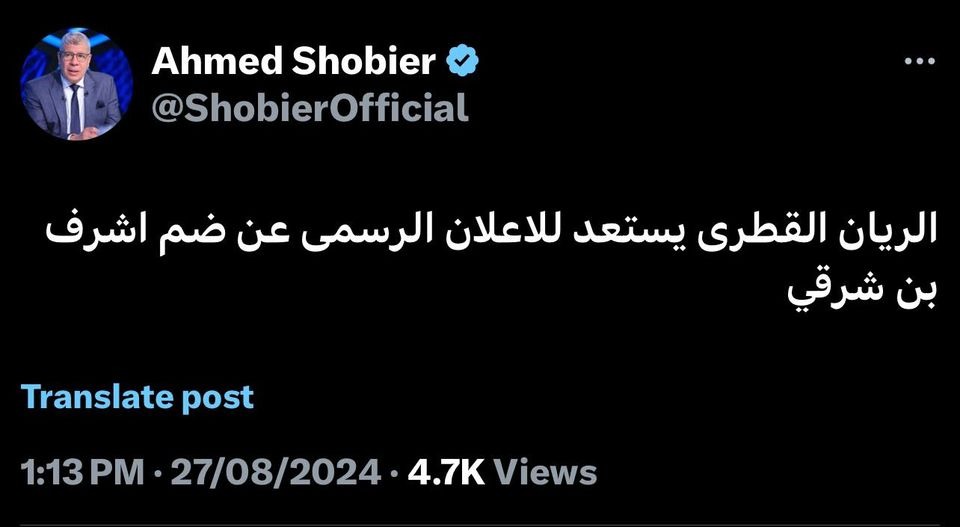 وكتب شوبير على صفحته الشخصية عبر موقع التواصل الاجتماعي "فيس بوك": "الريان القطري يستعد للإعلان الرسمي عن ضم أشرف بن شرقي".