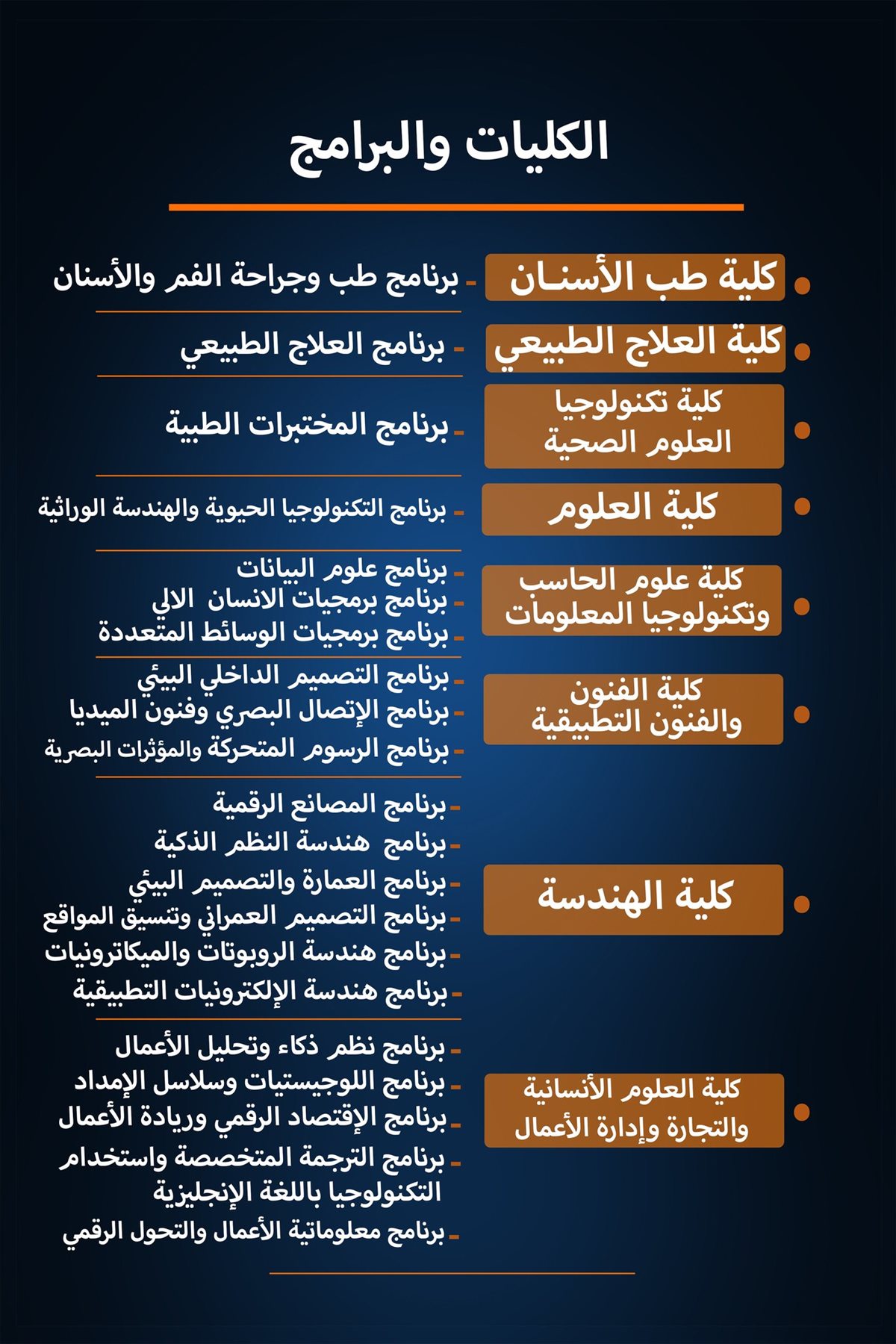 - كلية الهندسة – برنامج هندسة الإلكترونيات التطبيقية – برنامج هندسة المصانع الرقمية – برنامج العمارة والتصميم البيئي- برنامج التصميم العمراني المستدام.