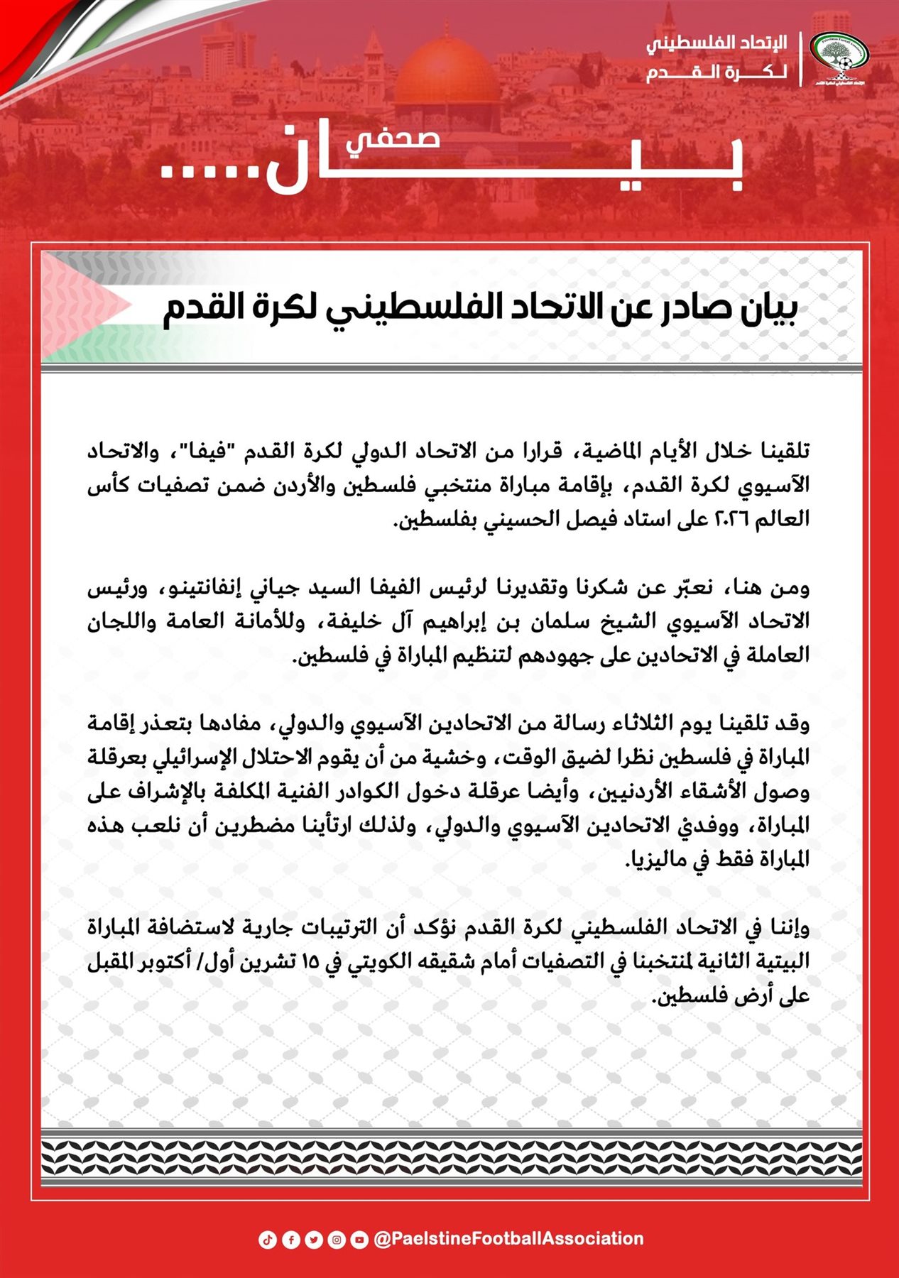 وتلقى الاتحاد الفلسطيني، أمس الثلاثاء، رسالة من الاتحادين الآسيوي والدولي، مفادها: "تعذر إقامة المباراة في فلسطين نظرا لضيق الوقت، وخشية من أن يقوم الاحتلال الإسرائيلي بعرقلة وصول الأشقاء الأردنيين، وأيضا عرقلة دخول الكوادر الفنية المكلفة بالإشراف على المباراة، ووفديْ الاتحادين الآسيوي والدولي، ولذلك ارتأينا مضطرين أن نلعب هذه المباراة فقط في ماليزيا".