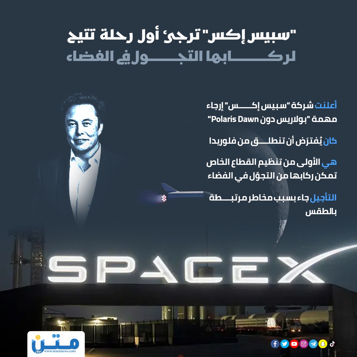 - أعلنت شركة "سبيس إكس" إرجاء مهمة "بولاريس دون Polaris Dawn".