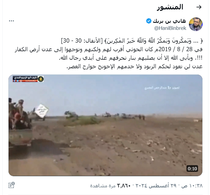 وأشار في تغريدة على منصة أكس حيث قال: إلى أن الذين اختاروا التوجه إلى عدن في 28 أغسطس 2019 بدلًا من مواجهة الحوثيين، قد واجهوا مصيرهم المحتوم على أيدي رجال الله، مؤكدًا أن عدن لن تكون تحت سيطرة الحوثيين أو الإخوان مرة أخرى.