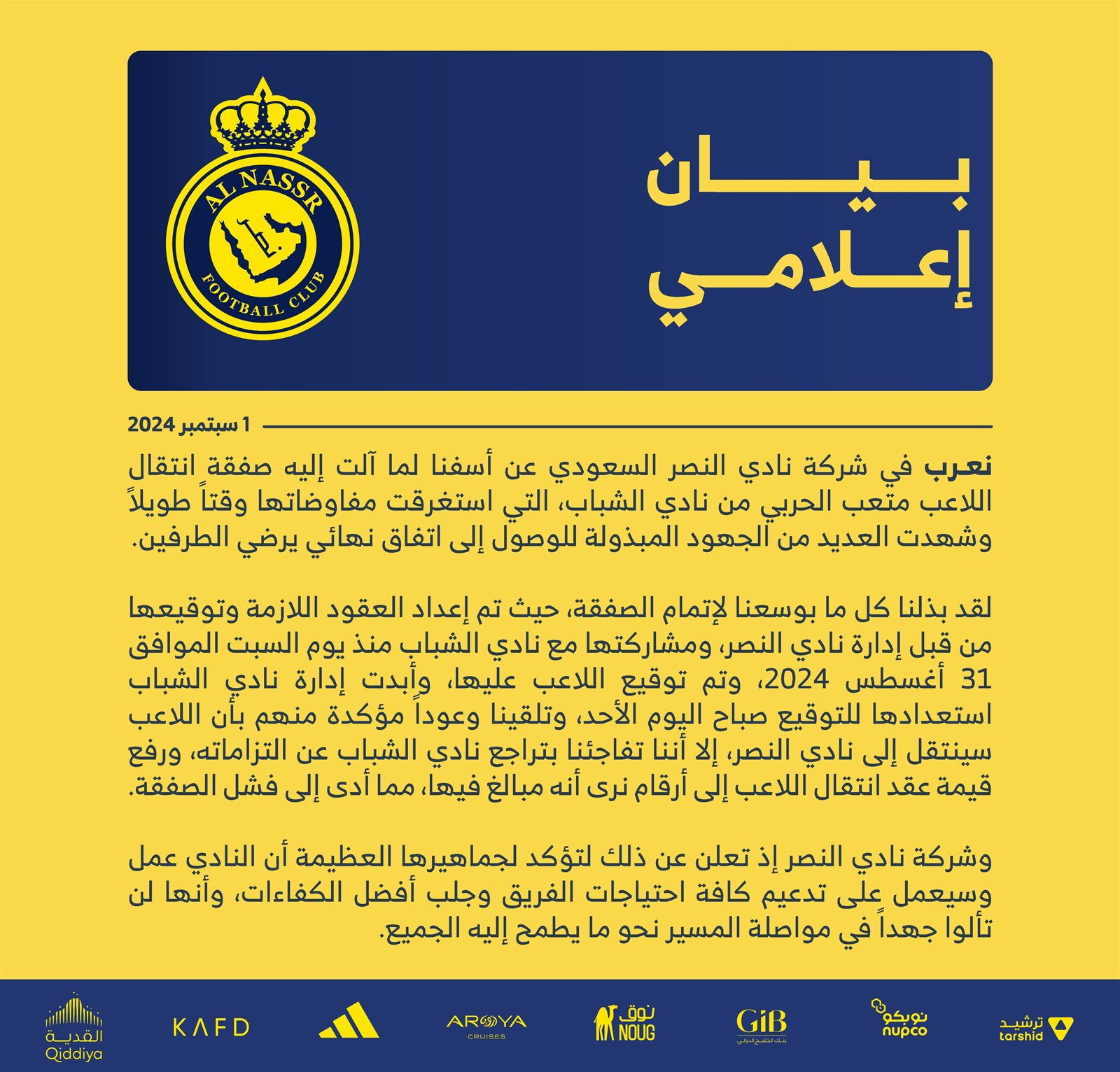"لقد بذلنا كل ما بوسعنا لإتمام الصفقة، حيث تم إعداد العقود اللازمة وتوقيعها من قبل إدارة نادي النصر، ومشاركتها مع نادي الشباب منذ يوم السبت الموافق 31 أغسطس 2024".