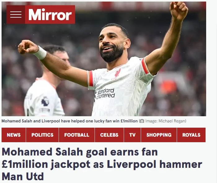ربح مشجع من مدينة ساوثهامبتون الإنجليزية جائزة مالية قدرها مليون جنيه إسترليني بعد تسجيل محمد صلاح الهدف الثالث لفريق ليفربول في شباك مانشستر يونايتد في المباراة التي انتهت لصالح الريدز بثلاثية نظيفة، ضمن منافسات الجولة الثالثة من الدوري الإنجليزي الممتاز.