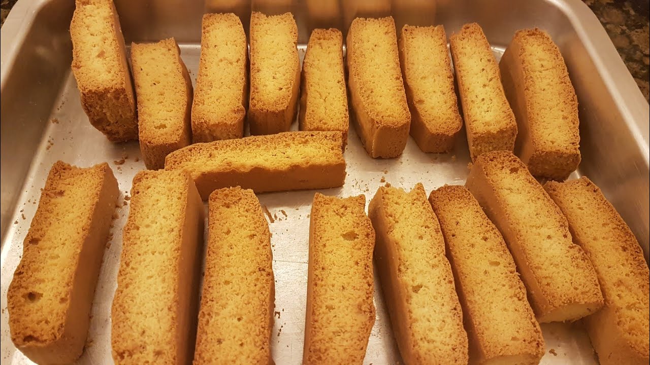 - اتركيه يهدأ ثم قطعيه بالسكين إلى قطع طولية تتشابه مع البسكويت ورصيه في صينية منخفضة الحواف.