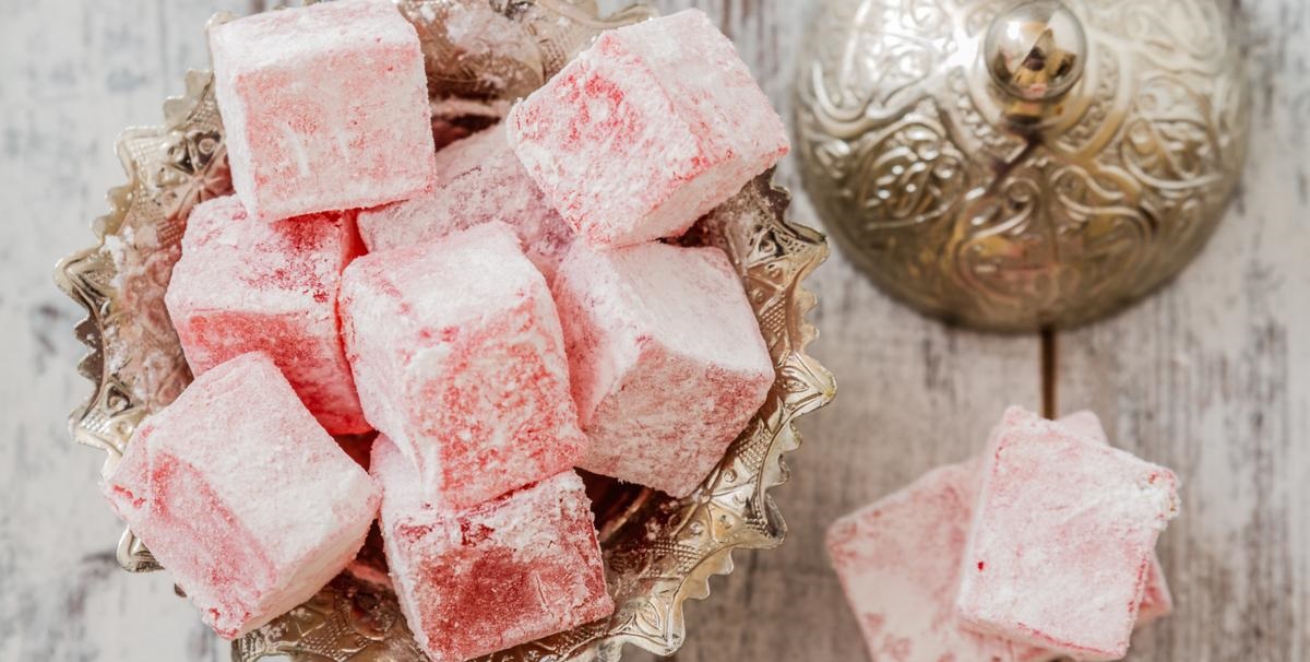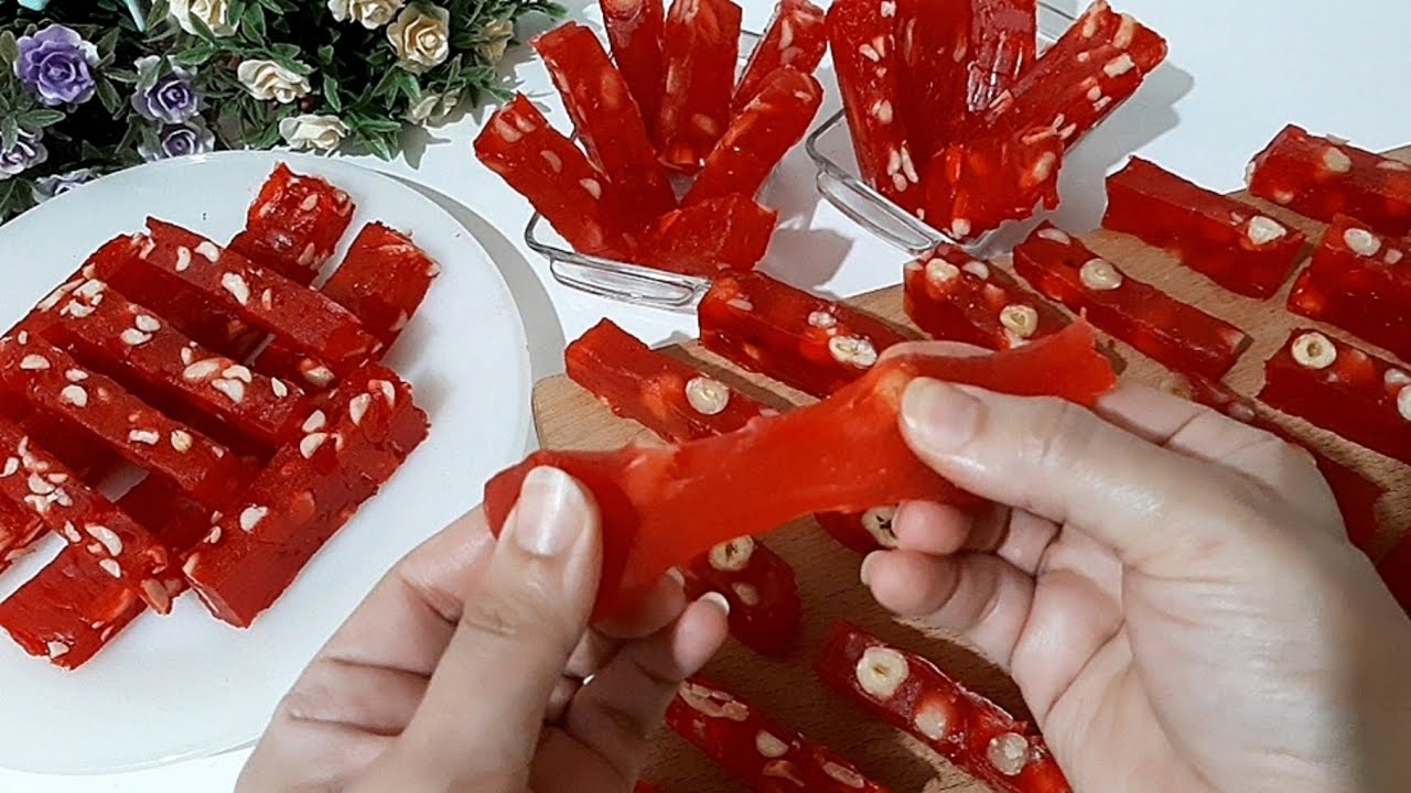 - ضعي النشا والجيلاتين على حلة السكر والماء على النار ثم أضيفي اللون الأحمر والبندق وماء الورد.