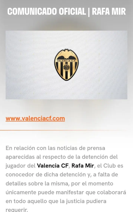 وأصدر نادي فالنسيا بيانًا رسميًّا، بشأن الواقعة، وجاء فيه: "فيما يتعلق بالأخبار الصحفية التي ظهرت بشأن اعتقال اللاعب رافا مير، يود النادي أن يوضح أنه على علم بهذا الاعتقال، وبما أن التفاصيل المتعلقة به غير متوفرة حاليًّا، فإن النادي يمكنه فقط أن يؤكد أنه سيتعاون في كل ما تتطلبه العدالة".