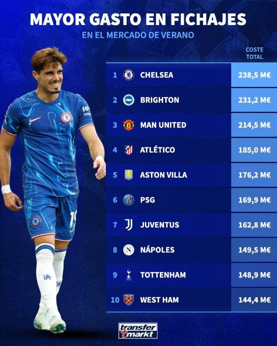 ويتصدر نادي تشيلسي الإنجليزي قائمة أكثر أندية أوروبا إنفاقًا علي الصفقات هذا الصيف بـ 238.5 مليون يورو، متقدما علي برايتون، الذي سجل رقمه القياسي بمبلغ 231.2 مليون يورو، ومانشستر يونايتد بإنفاق 214.5 مليون يورو.