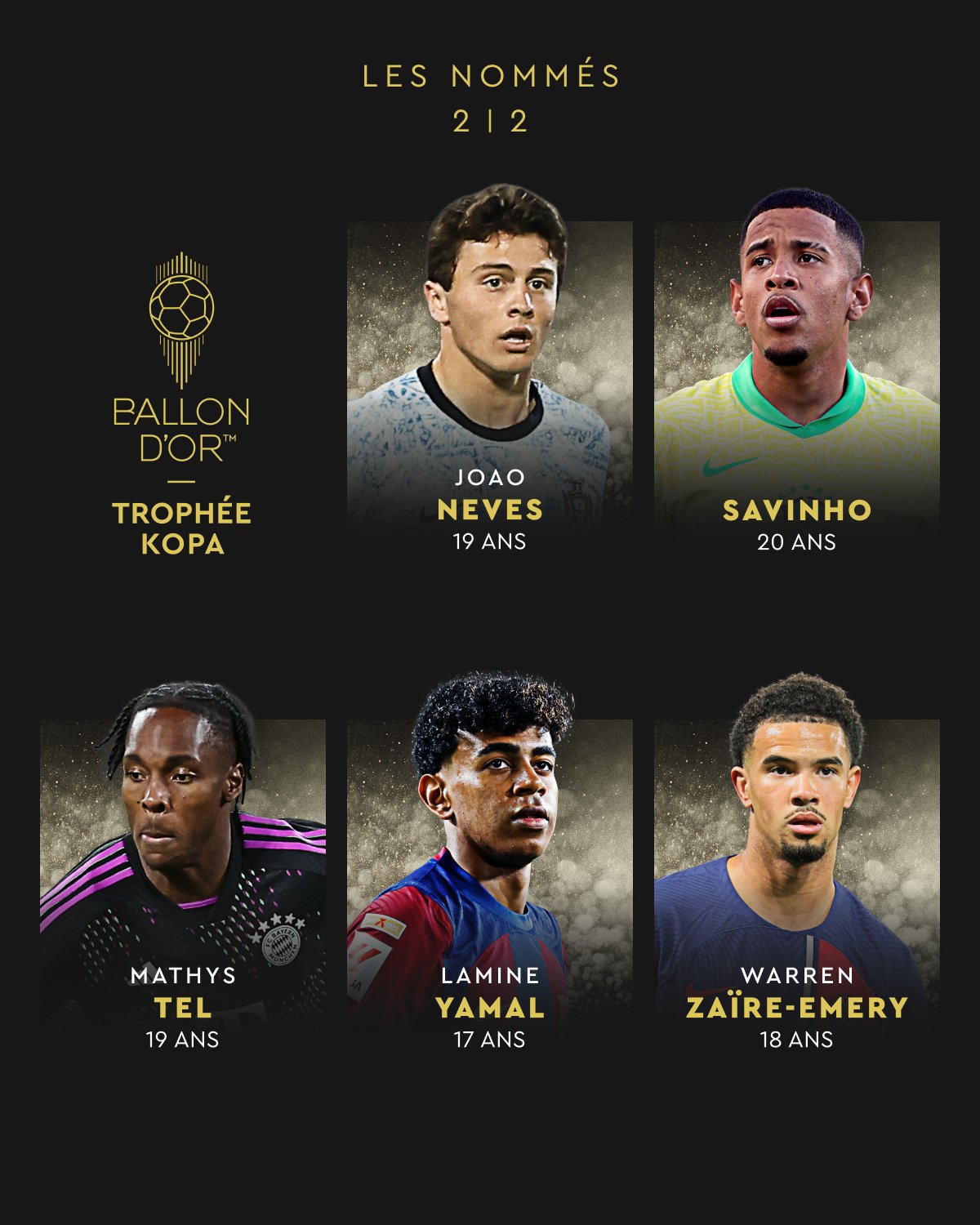 وينافس لامين جمال لاعب برشلونة ومنتخب إسبانيا، ونظيره كوبي ماينو من مانشستر يونايتد ومنتخب إنجلترا على جائزة "كوبا تروفي" الممنوحة لأفضل لاعب شاب في العالم.
