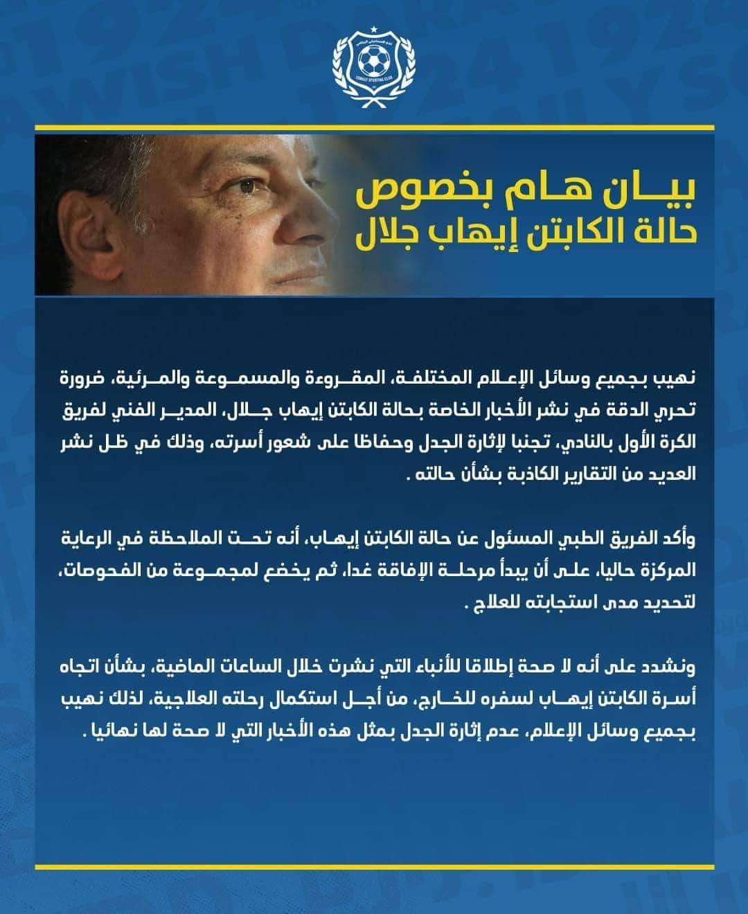 وأشار الإسماعيلي إلى أن النادي سيوافي المتابعين تباعا بتطورات الحالة الصحية لإيهاب جلال.