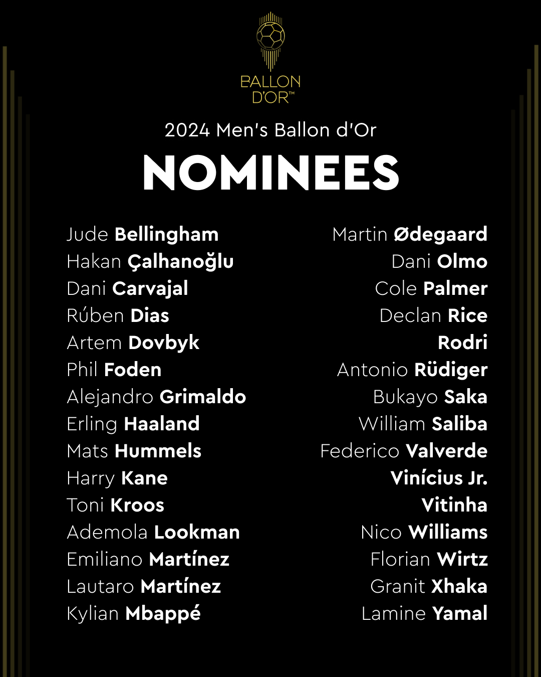 أعلنت مجلة "فرانس فوتبول" الفرنسية، اليوم الأربعاء، عن قائمة المرشحين لجوائز الكرة الذهبية كأفضل لاعب في العالم لعام 2024.