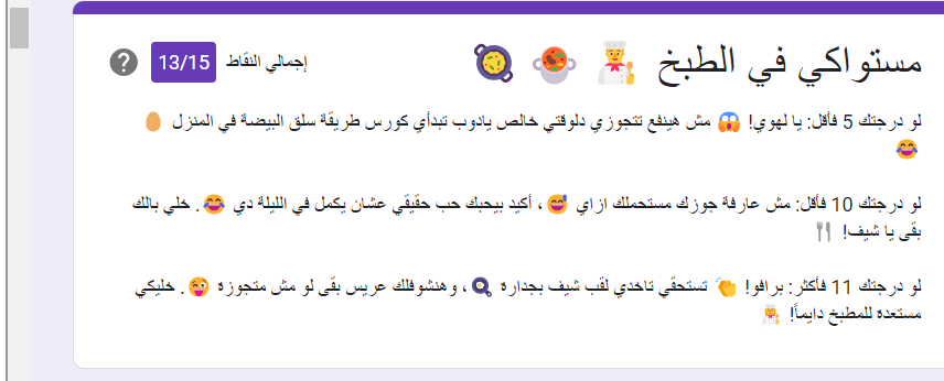 ويتكون اختبار مستواكي في الطبخ من 15 سؤال، لكل واحد ثلاث اختيارات تختار منها السيدة.