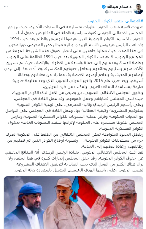قال د. صدام عبدالله رئيس قطاع الصحافة والإعلام الحديث مستشار اللواء عيدروس الزُبيدي الإعلامي:" شهدت قضية شعب الجنوب تطورات متسارعة في السنوات الأخيرة، حيث برز دور المجلس الانتقالي الجنوبي كقوة سياسية فاعلة في الدفاع عن حقوق أبناء الجنوب، لا سيما الكوادر الجنوبية الذين تعرضوا للتهميش والظلم بعد حرب 1994".