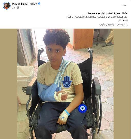 كشفت الفنانة هاجر الشرنوبي، عن إصابة ابنها في أول أيام الدراسة وذلك عبر حسابها الرسمي على "فيسبوك".